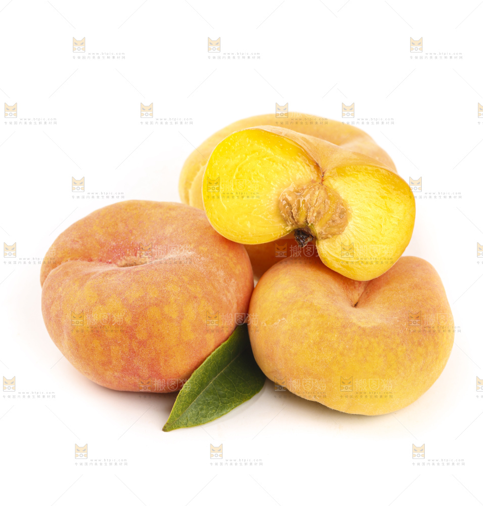 白底上放着切开的黄金蟠桃