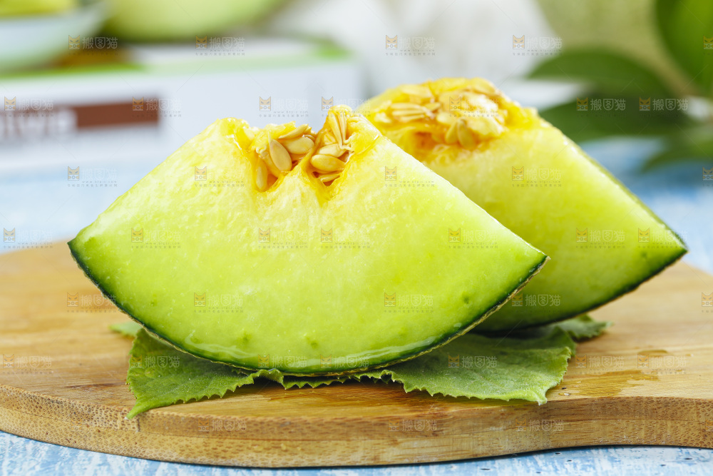 蓝底上放着切开的玫珑瓜
