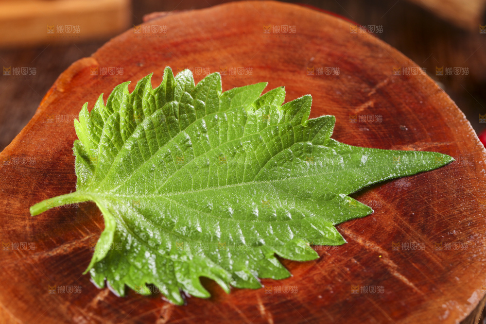 木底上的新鲜紫苏叶