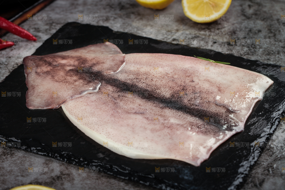 黑石板上摆放着鱿鱼