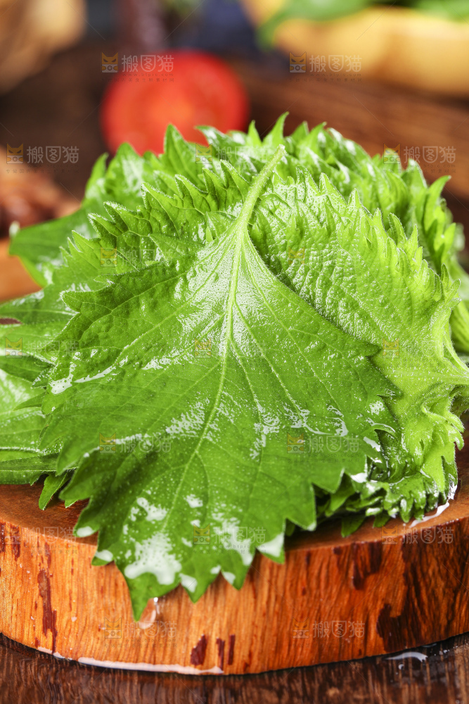 木底上的新鲜紫苏叶