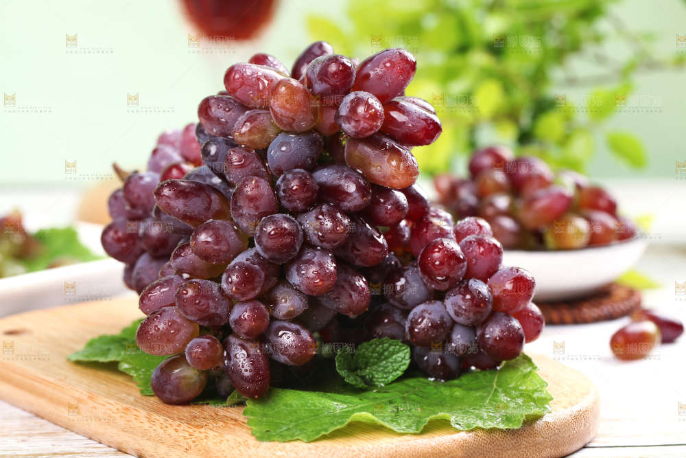 木板上放着一串玫瑰香提子