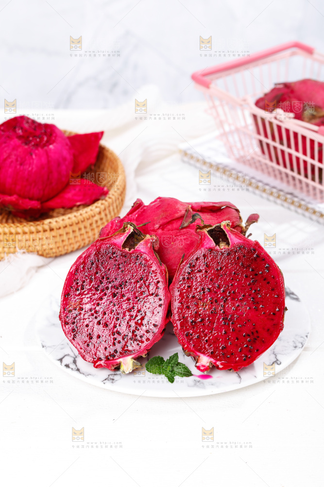 白底上摆放着越南红心火龙果