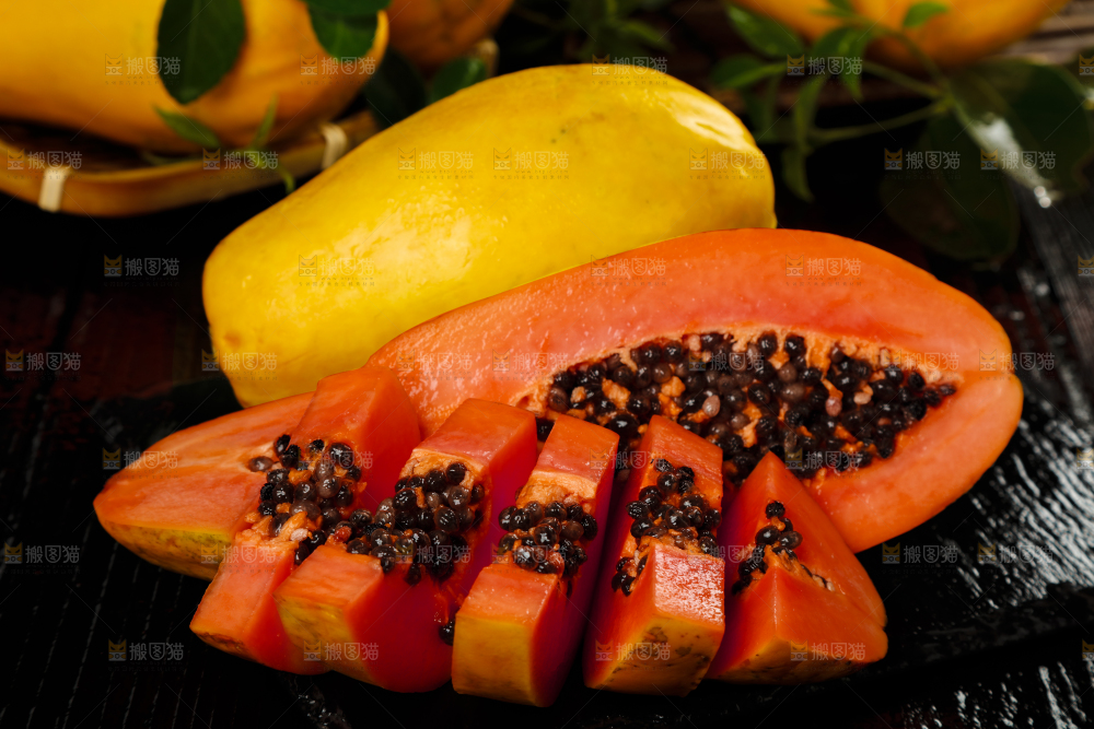 黑底上放着新鲜的海南红心木瓜