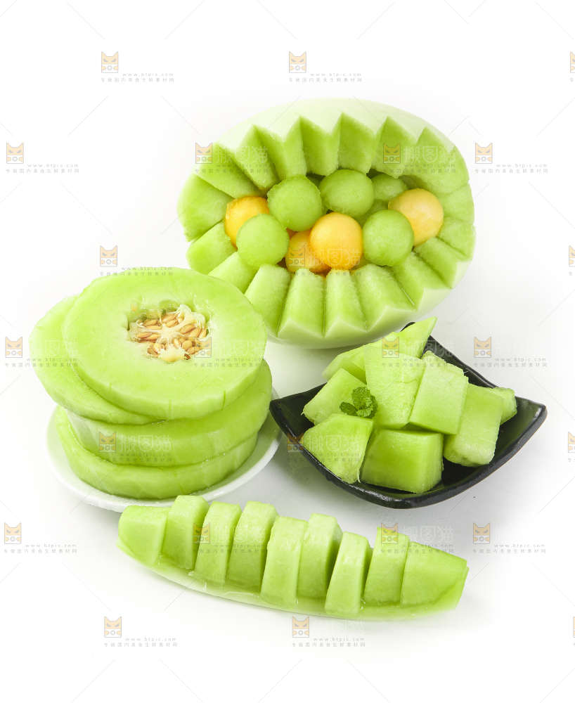 白底上摆放着玉菇蜜瓜