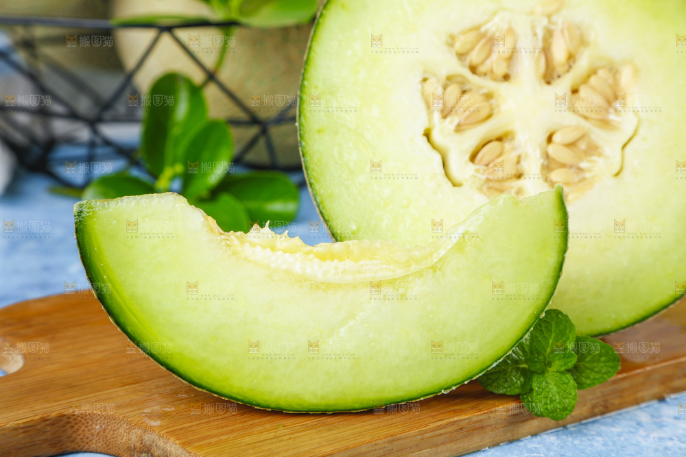 木底上放着切开的玫珑网纹蜜瓜