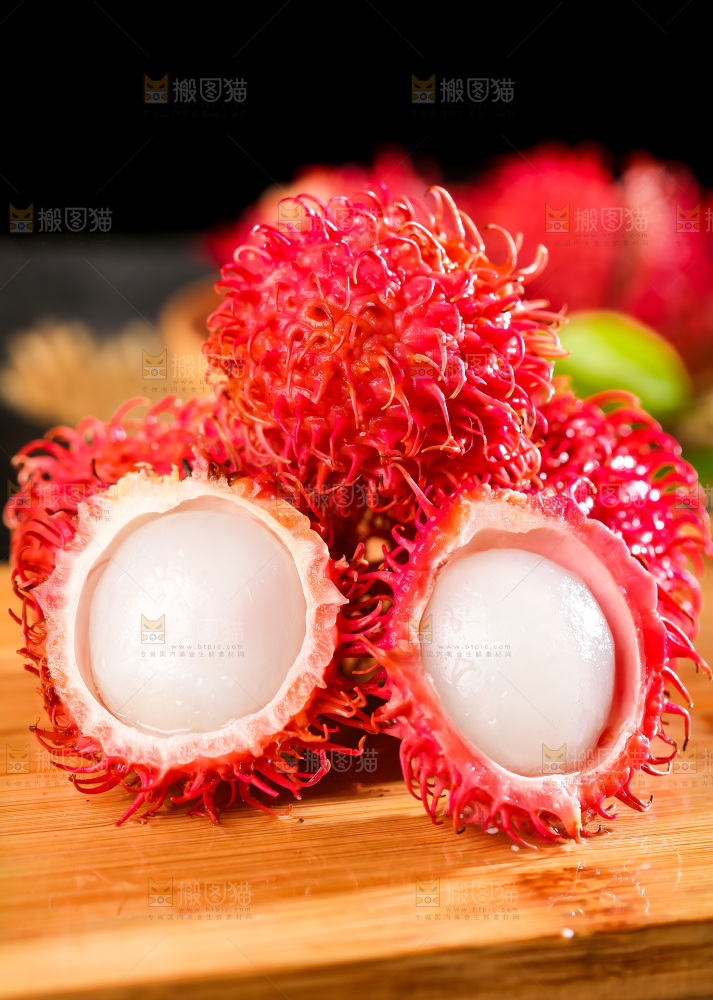 木板上放着新鲜红毛丹