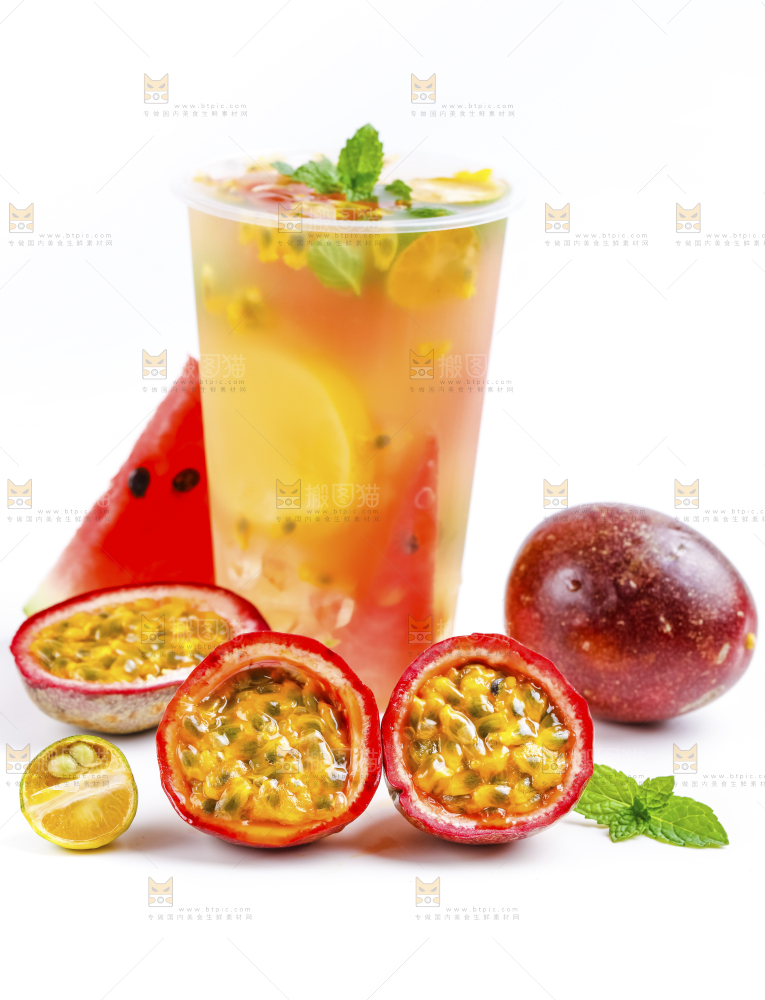 白底上放着一杯百香果果汁