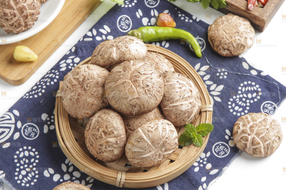 蓝布上放着香菇