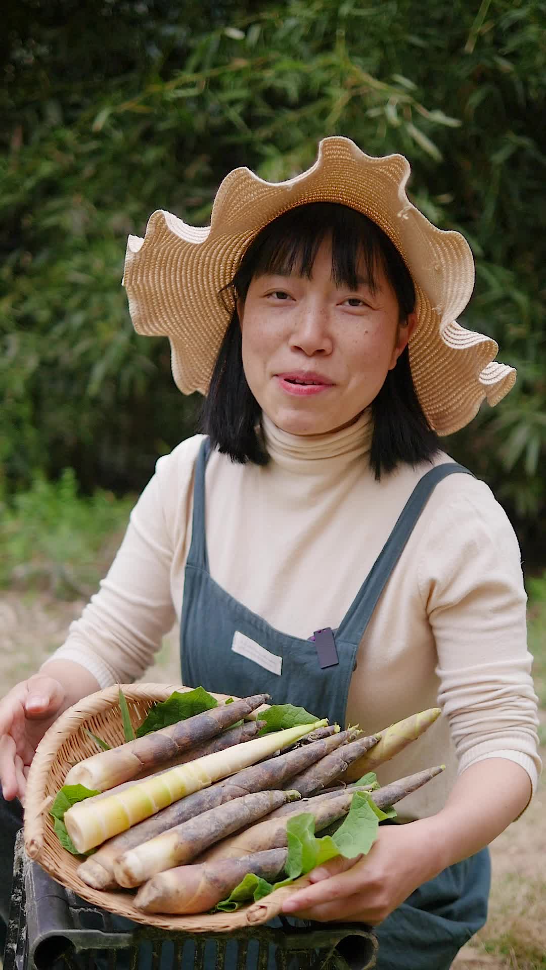 农民手里端着一篮小春笋
