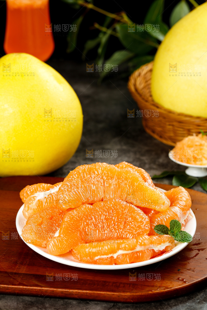 木板上放着一盘黄金柚果肉