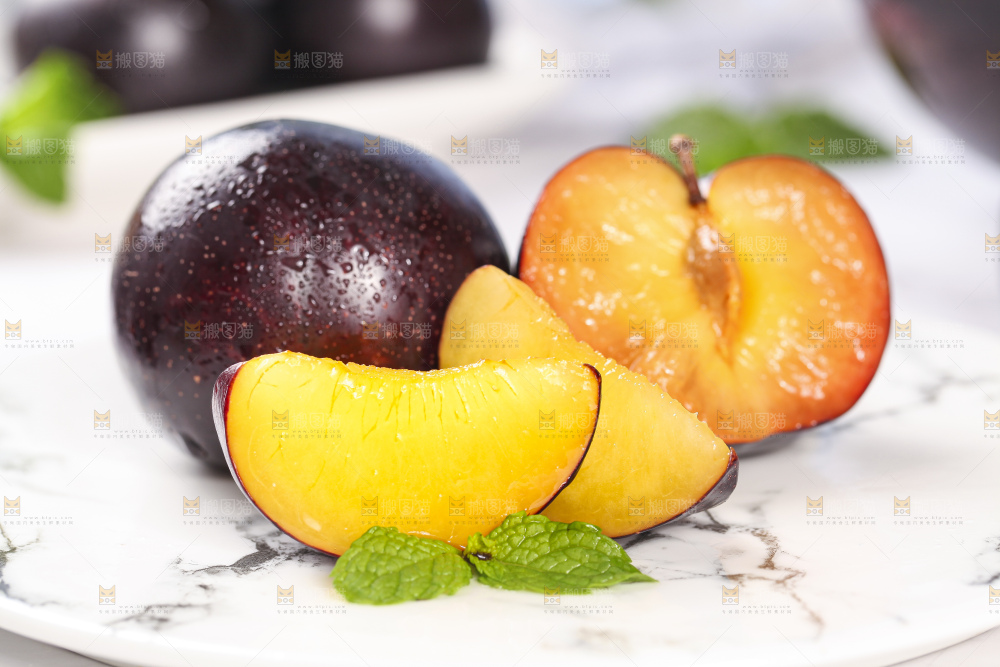 盘子里放着切开的黄肉黑布李