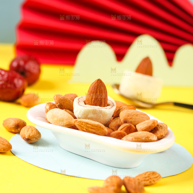 浅底上放着一碟杏仁奶枣