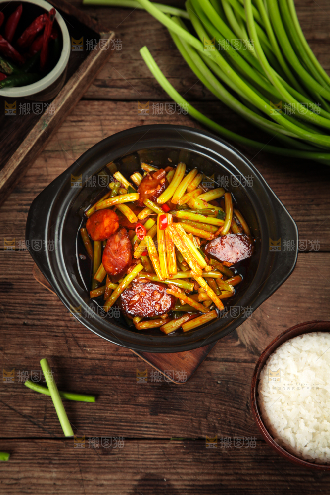 木底上放着一锅蒜毫炒腊肠
