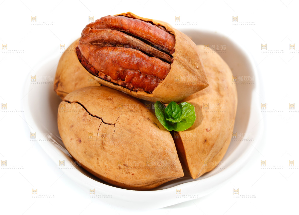 一碟碧根果放在白底上
