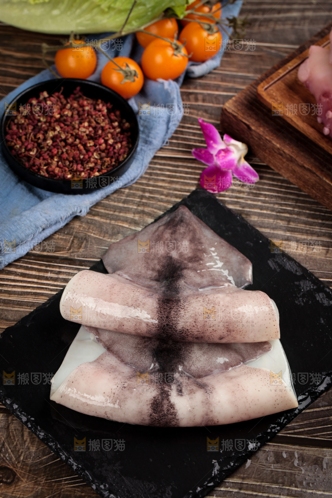 黑石板上摆放着鱿鱼