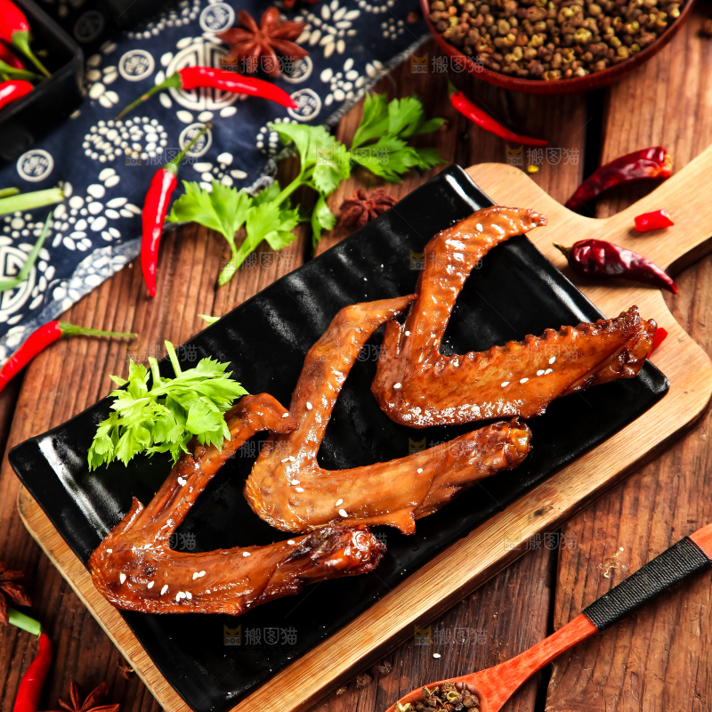 木底上放着一盘秘制鸭翅