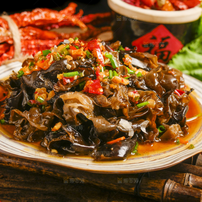 木底上放着一盘香辣木耳
