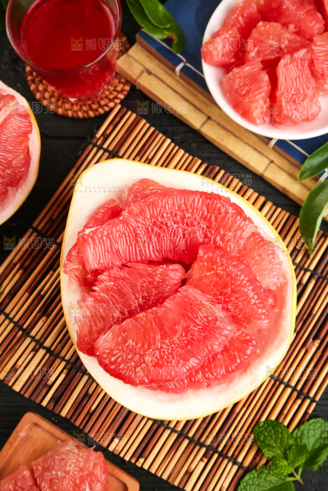 竹底上盘子里的红肉柚子