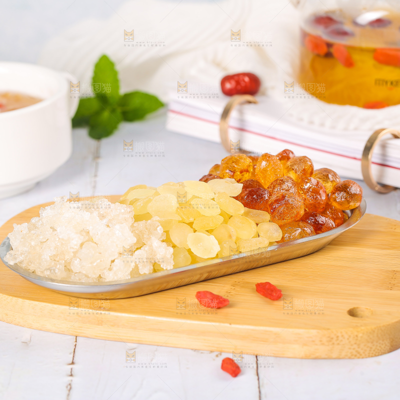 木板上放着一盘桃胶雪燕皂角米