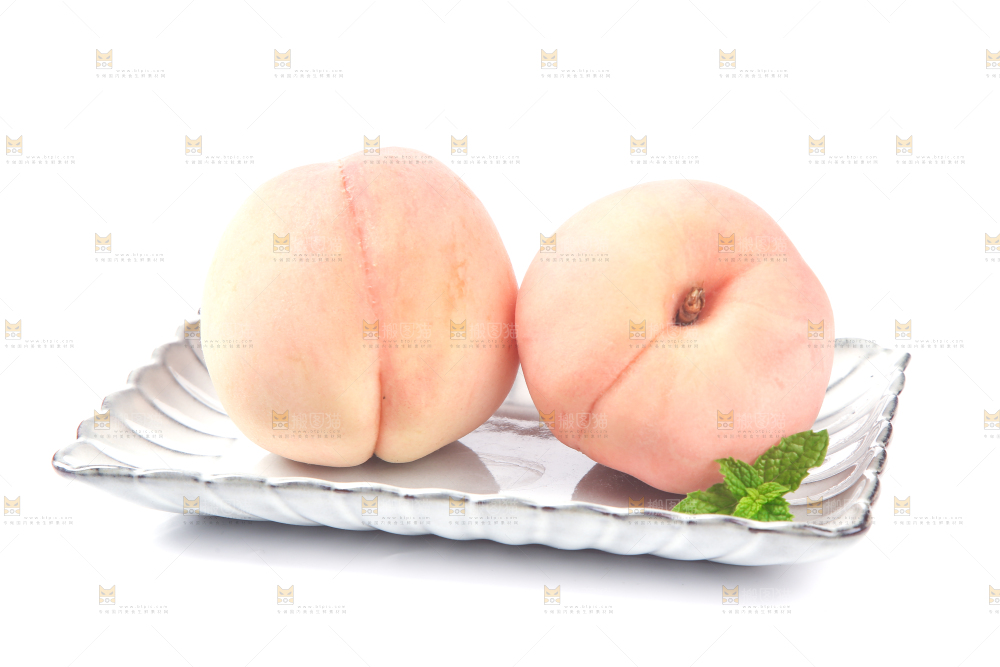 白底上放着一盘阳山水蜜桃