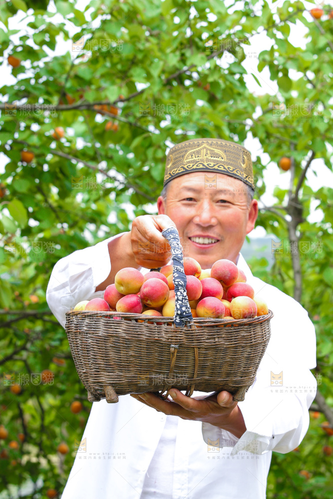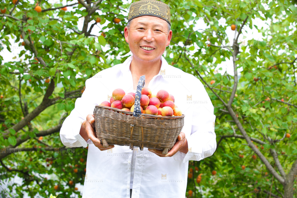 果园里男人手里拿着一篮新疆小红杏