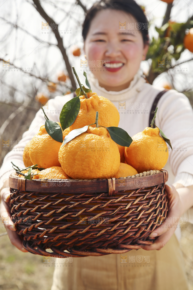 果园女孩手里抱着一篮四川丑橘