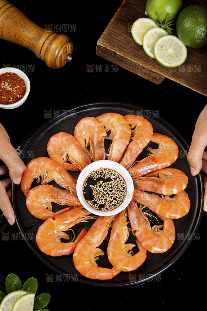 手上端着一盘大虾