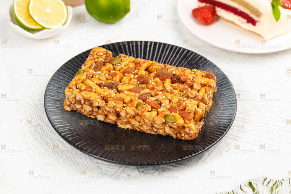 浅底上放着一盘每日坚果沙琪玛