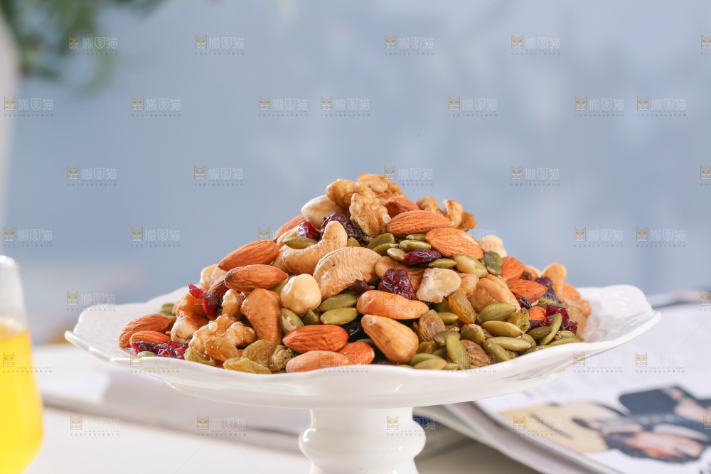 桌子上放着一盘坚果组合