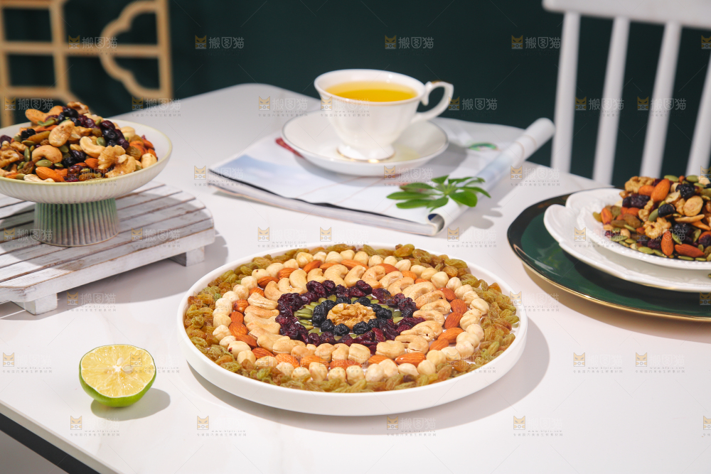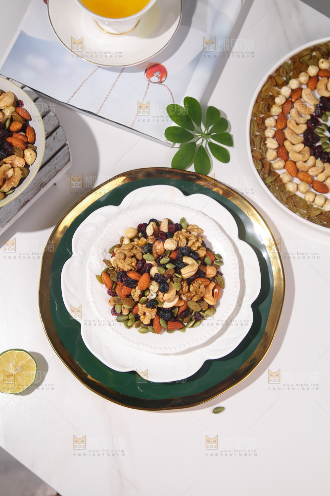 浅底上放着一盘坚果组合