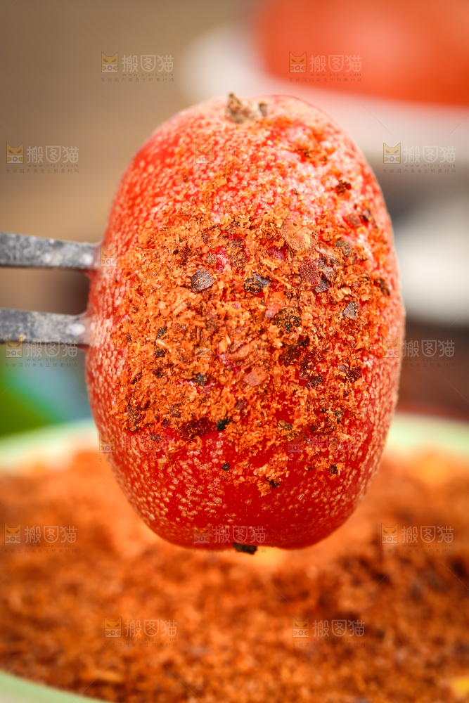 叉子插着蘸辣椒粉的羊奶果