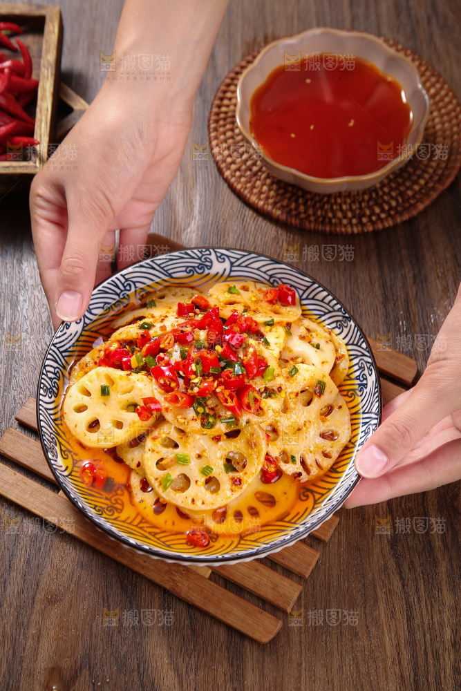 手端着一盘红油藕片