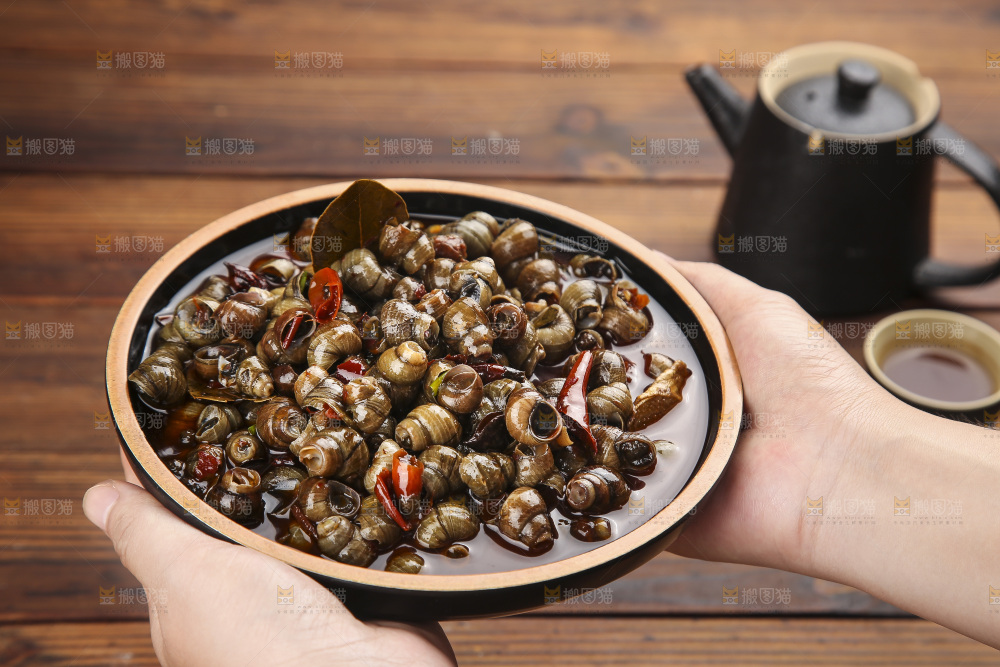 手端着一碗香辣田螺