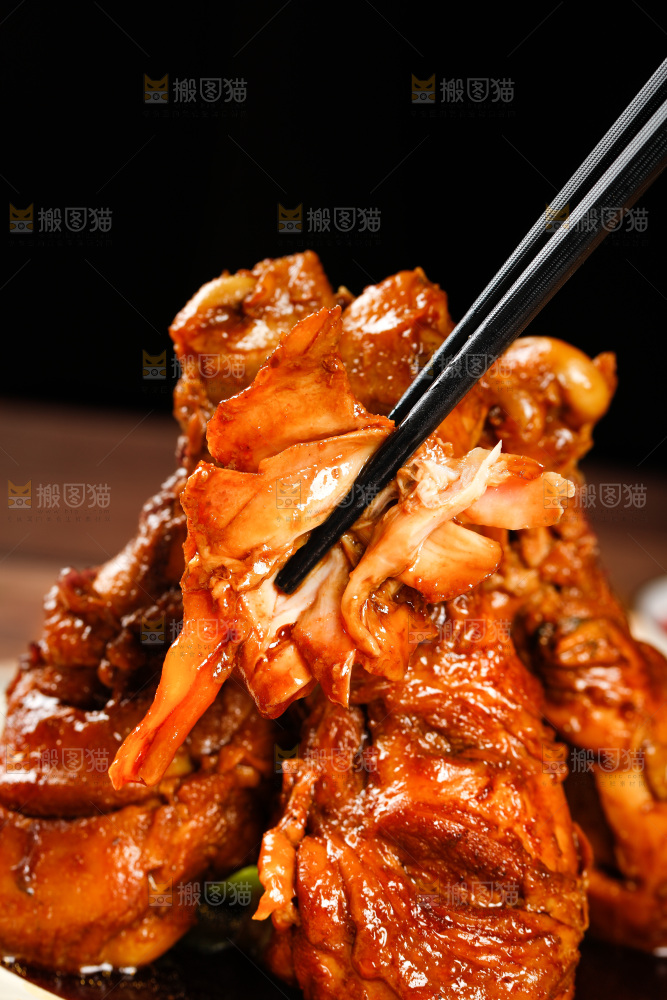 筷子上夹着红烧鸡腿