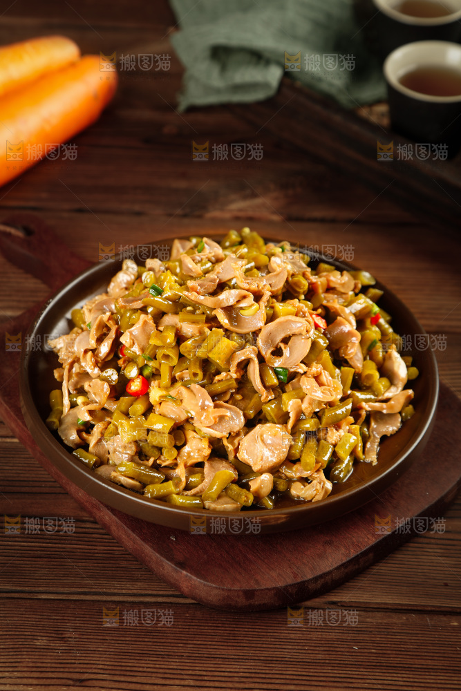 木底上放着一盘酸豆角炒鸡胗