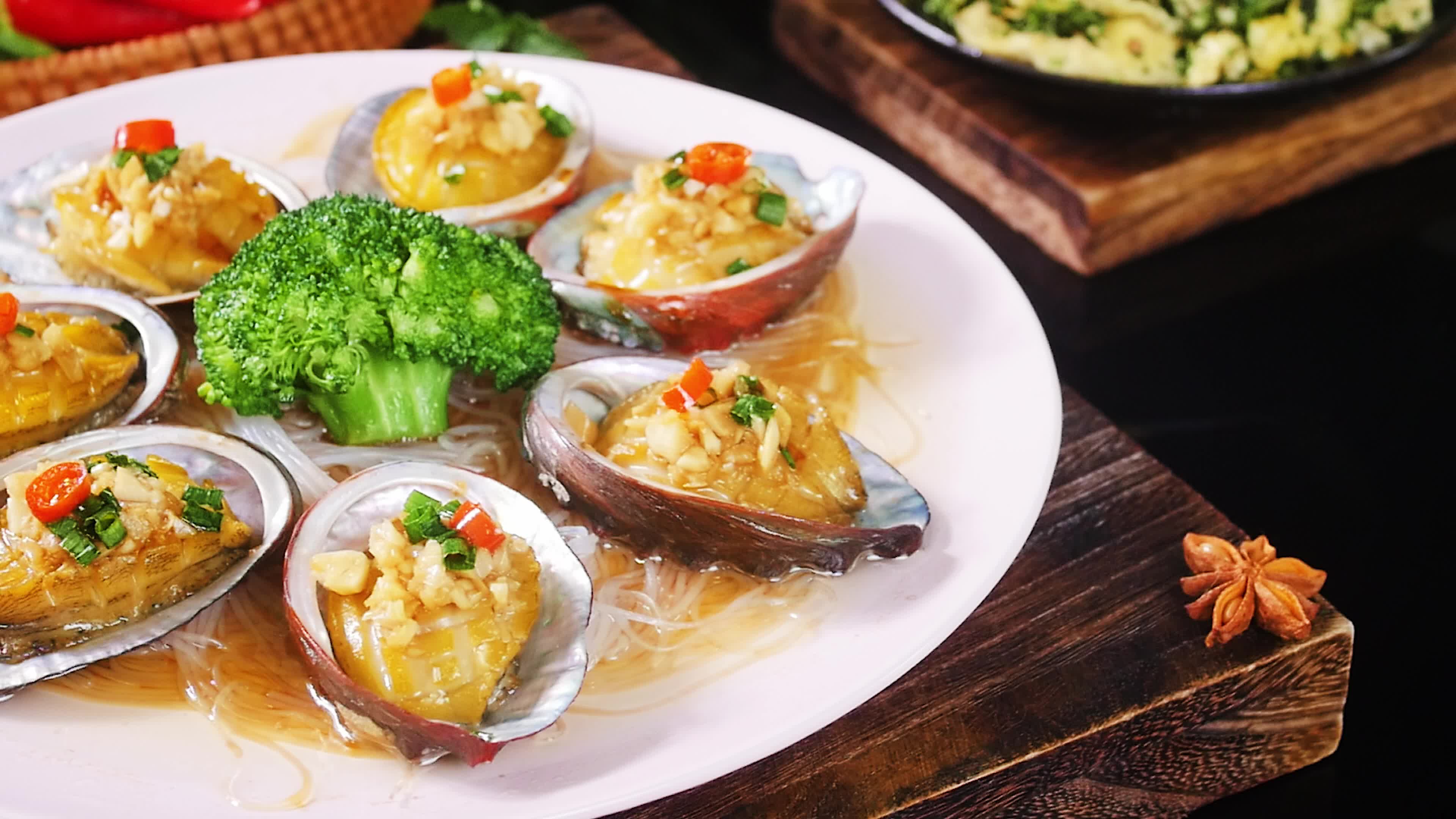 手里端着一盘蒜蓉粉丝蒸鲍鱼