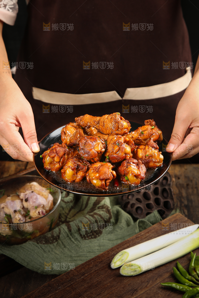 手里端着一盘红烧鸡腿