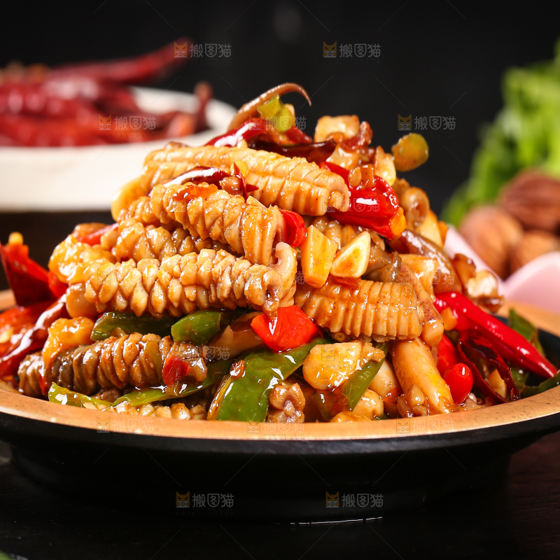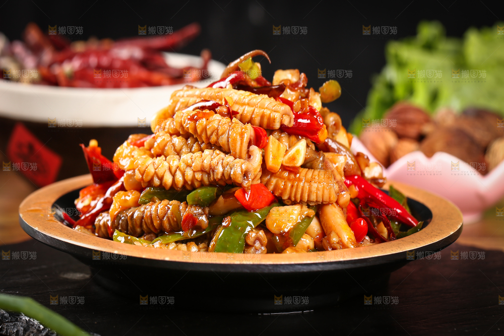 黑底上放着一盘辣炒鱿鱼身